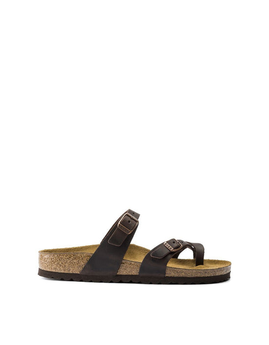 Supremely comfortable with sophisticated, crisscross straps, the Mayari redefines the thong sandal with a single toe loop. Oiled nubuck leather lends a perfectly lived-in look to the strappy style. Complete with classic BIRKENSTOCK design elements, like adjustable buckle closures and a contoured footbed for the ultimate in support.
